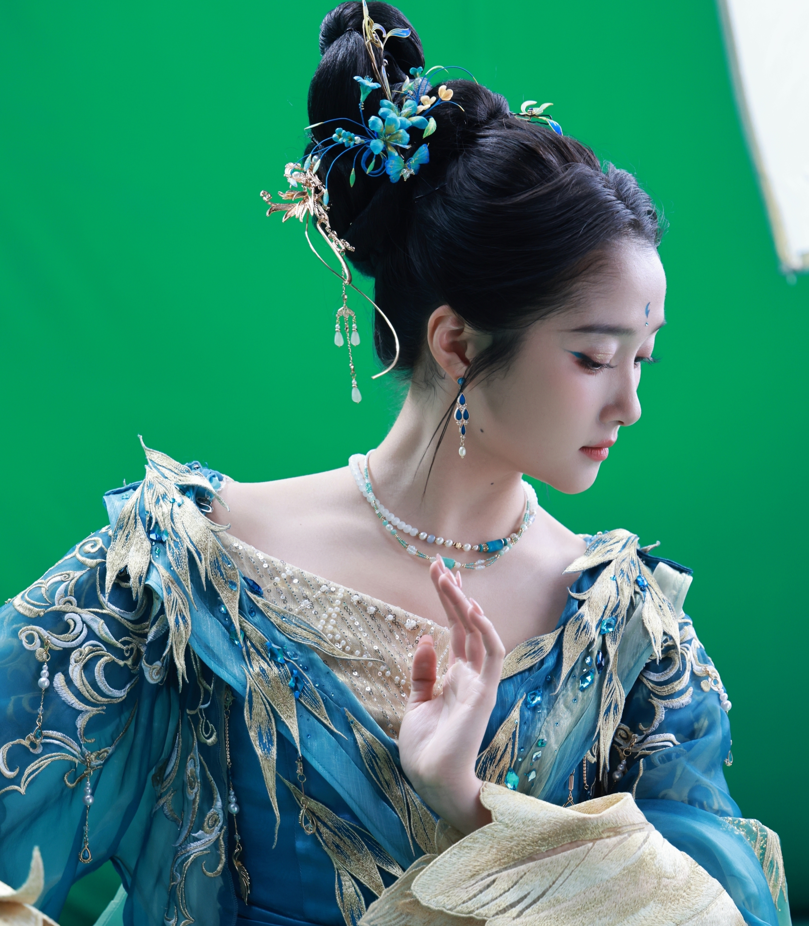 青鸟在中国传统文化中象征着吉祥与美好,常被赋予浪漫而神秘的色彩。关晓彤此次造型正是以这一经典意象为灵感,将古典神话元素与现代时尚语言巧妙融合。从曝光的画面来看,整体造型在色彩运用上颇为考究,青绿色调的主视觉既呼应了"青鸟"主题,又通过渐变层次的细腻处理营造出空灵飘逸的质感。服饰设计方面,轻盈的纱质面料与精致的刺绣工艺相得益彰,行走间衣袂翩跹,仿佛化身为从古籍画卷中走出的神女,将东方女性特有的含蓄婉约与灵动仙气展现得恰到好处。