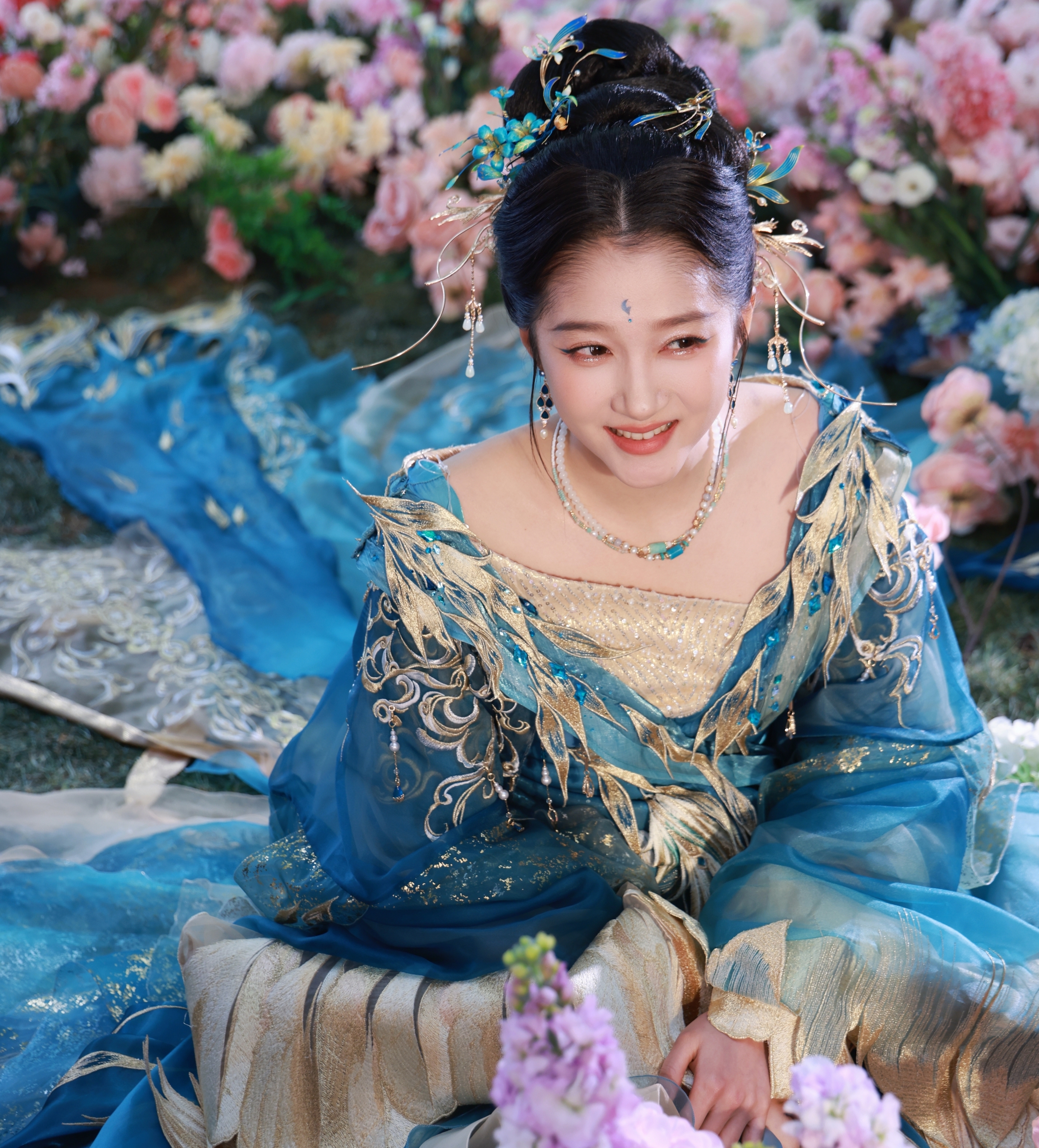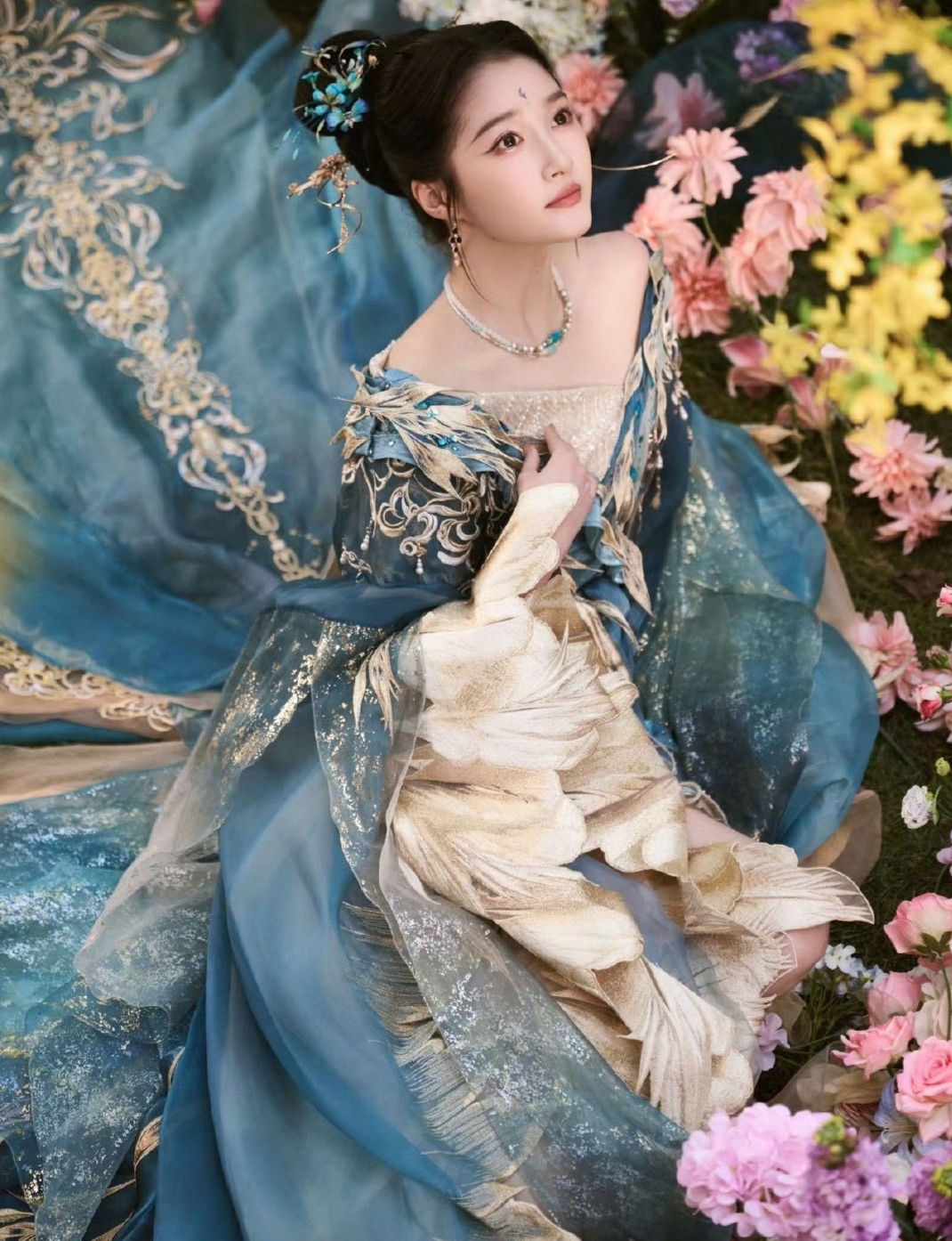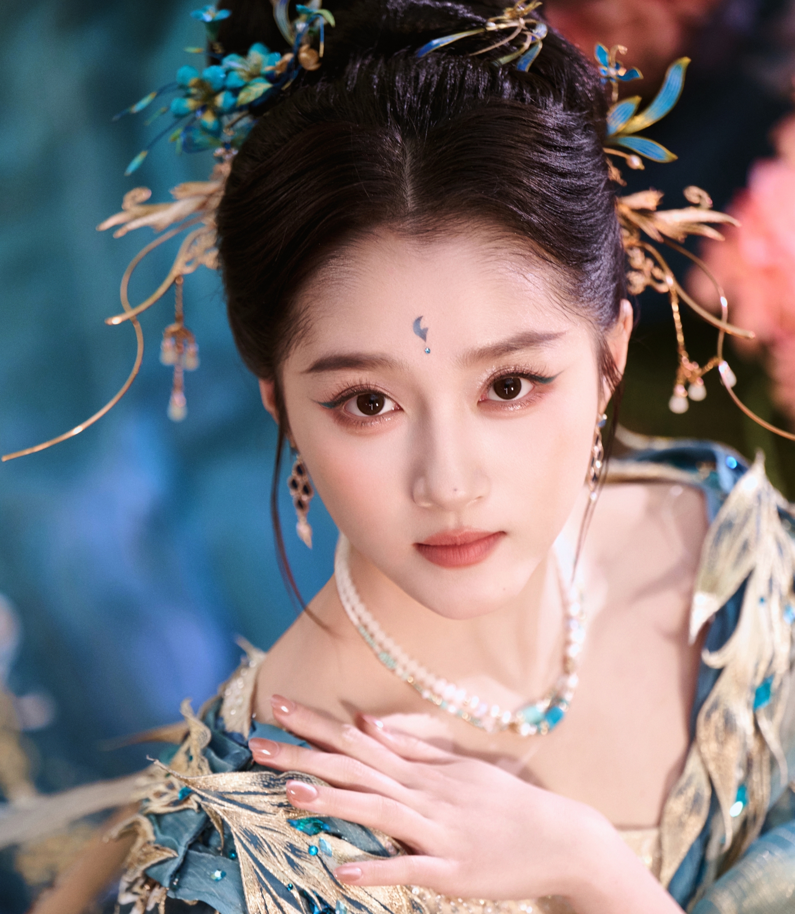 妆容设计同样是此次造型的一大看点。清透的底妆搭配富有古典韵味的眉眼妆容,既保留了关晓彤本人清新自然的气质特征,又通过细节处的艺术化处理强化了神话人物的超凡脱俗感。发饰的选择也颇为用心,简约而不失精致感的头饰与整体造型形成和谐统一,既避免了过度堆砌的繁复感,又在举手投足间流露出不经意的贵气。这种"少即是多"的美学理念,体现了造型团队对东方意境的深入理解。