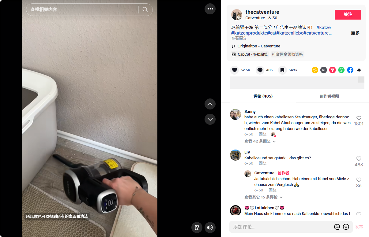 以TiKTok宠物达人@thecatventure为例,其视频内容就是记录日常清理宠物毛发的过程,通过真实的居家环境来展现产品真正使用起来是什么样子。