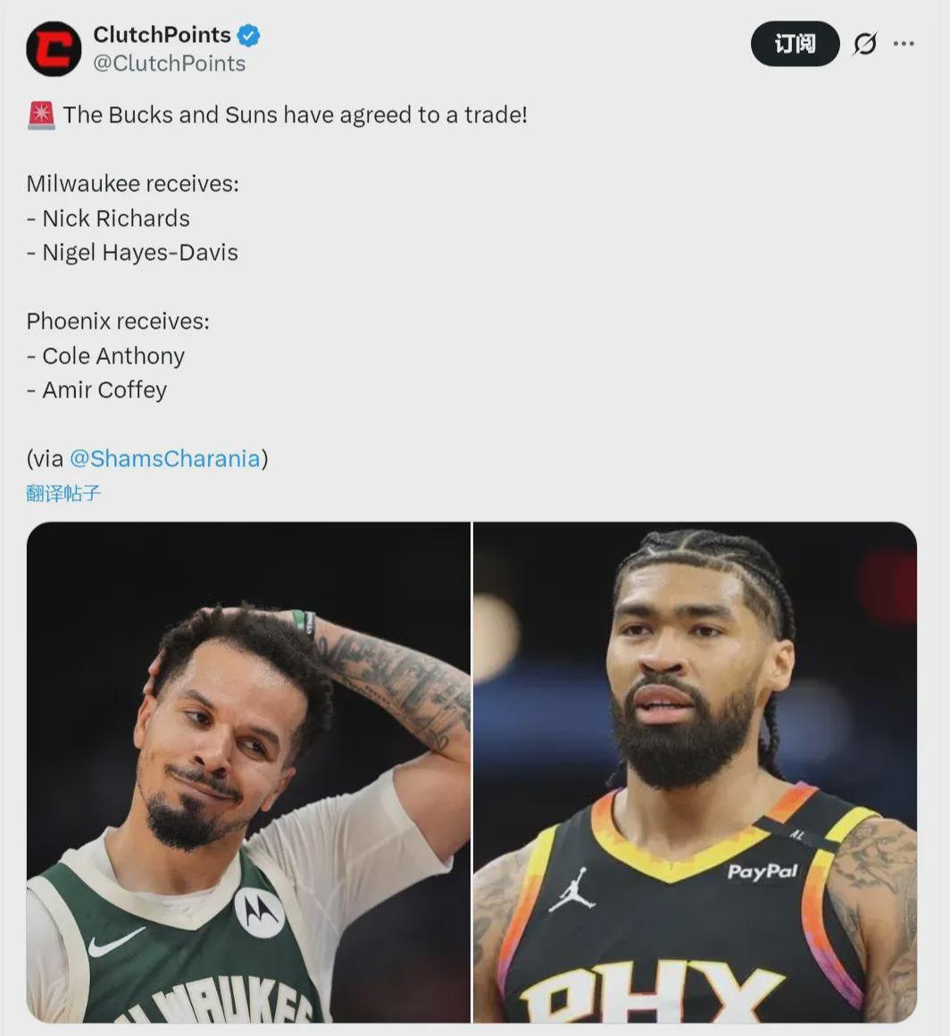更微妙的是,雄鹿并非按兵不动。就在宣布不动字母哥之后,他们迅速完成了一笔2换2小交易——送出科尔·安东尼和科菲,从太阳换回理查兹与奈奈尔·海斯·戴维斯。