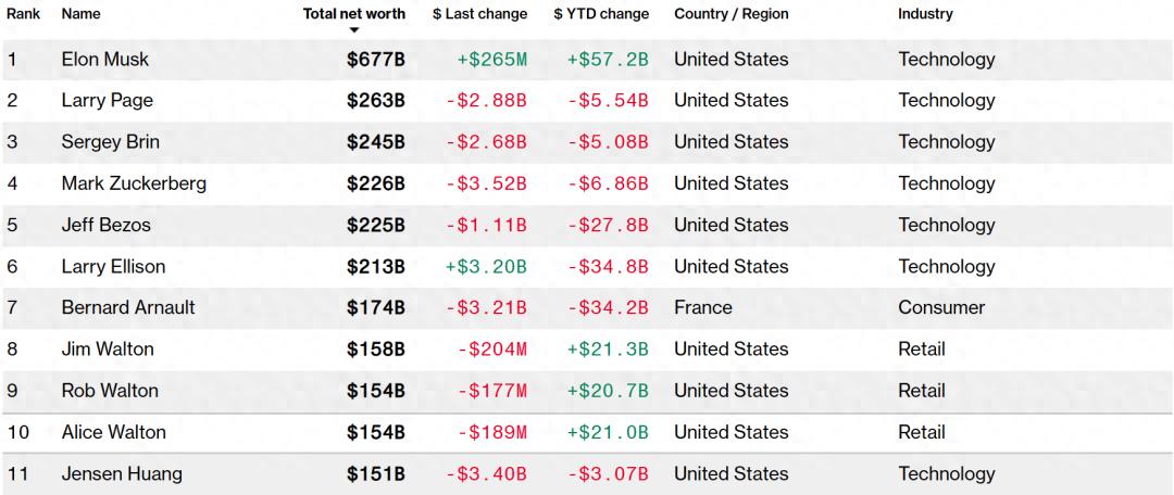 其它科技行业富豪财富也大幅缩水,但马斯克身家却仍再次增加。与此同时,零售商沃尔玛的创始成员Walton三兄妹进入全球前十,三人合计财富超过4500亿美元。