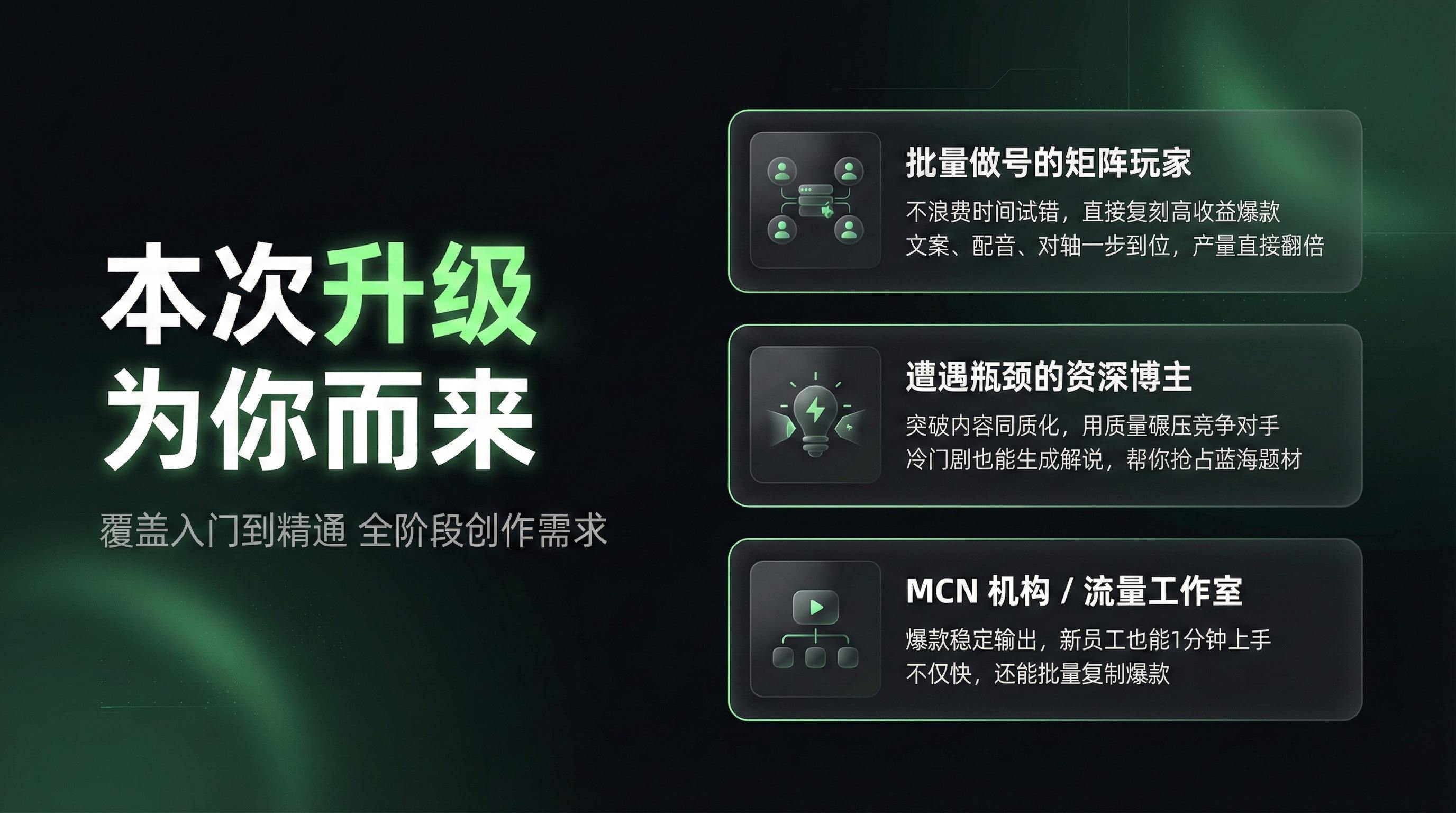 批量做号的矩阵玩家——不用试错,直接复刻高收益爆款模板,文案、配音、画面一步到位,产量翻倍。