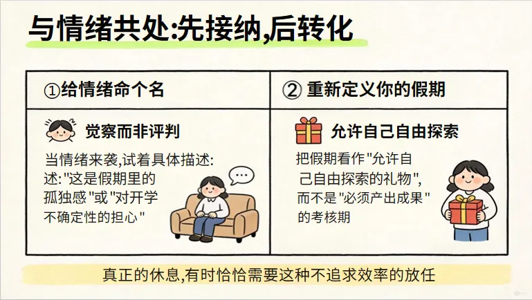 把假期看作“允许自己自由探索的礼物”,而不是“必须产出成果”的考核期。允许自己有无所事事的下午,有“浪费时间”的权利。真正的休息,有时恰恰需要这种不追求效率的放任。