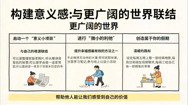 帮助他人是提升幸福感最有效的方法之一。不必做惊天动地的大事:帮邻居取快递,分享学习笔记,参与线上公益小活动。都能让我们感受到自己的价值。