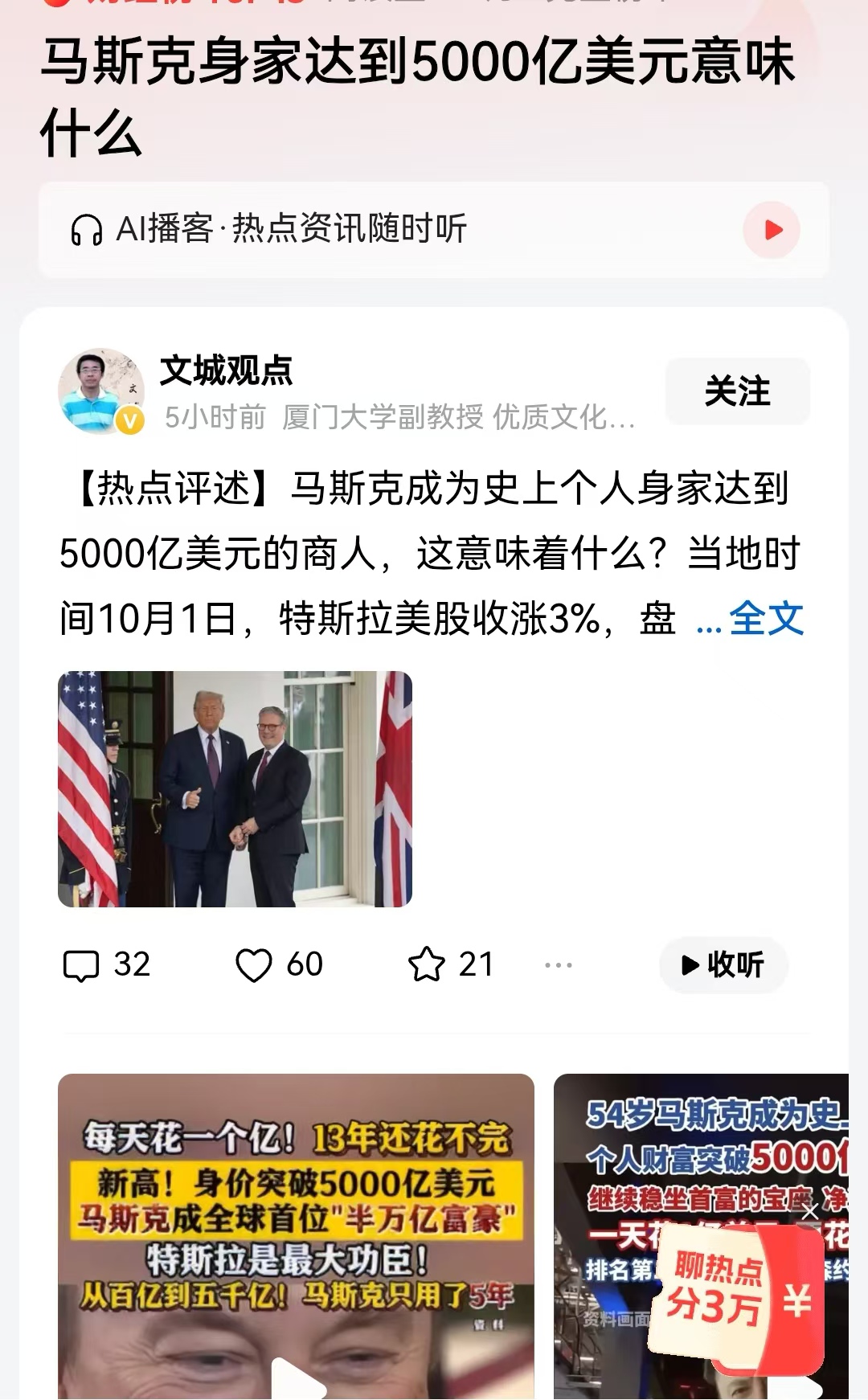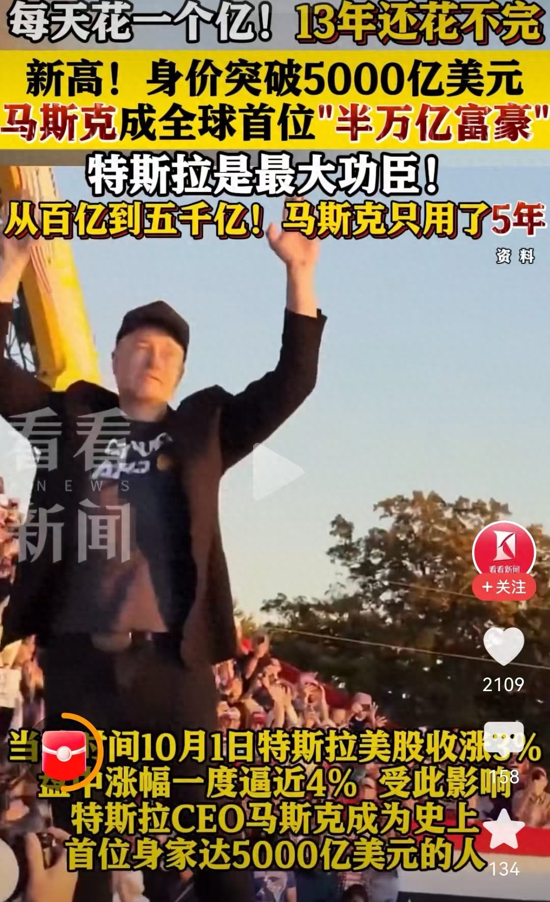 这可能就是人类进入到AI智能互联网社会后,个人财富拥有的上限悖论已经被突破,未来可能还会出现超级超级富豪。过去有一个定律说,单个家族永远不可能拥有万亿以上的财富,这是一个极限,只要财富达到一定程度,那么个人或者家族就会分裂、消耗、内耗,或者走向衰退。但是马斯克的财富,看来已经超越了这条传统定律的上限。