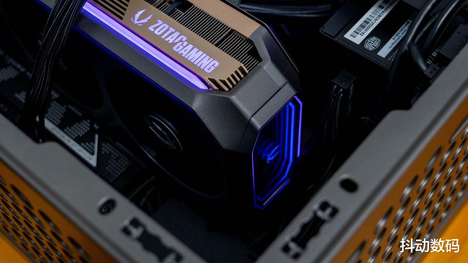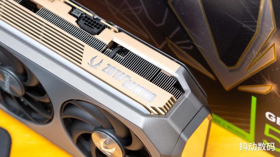 这款RTX 5080 AMP可能是索泰显卡中灯光最多的一款了,除了侧面的贯穿式灯带之外显卡侧面的ZOTAC GAMING也是做了灯光设计。