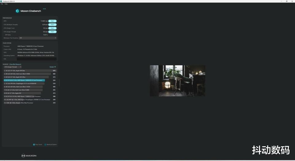 Cinebench 2026测试CPU多核分为5278 pts,单核 722 pts;GPU 成绩114867 pts。