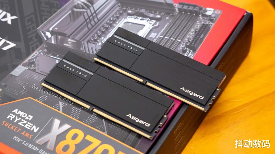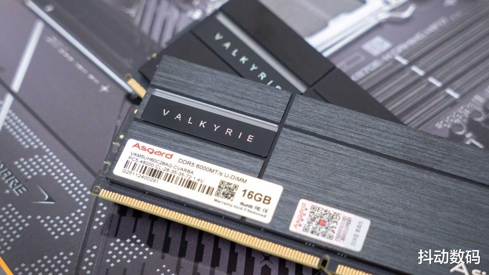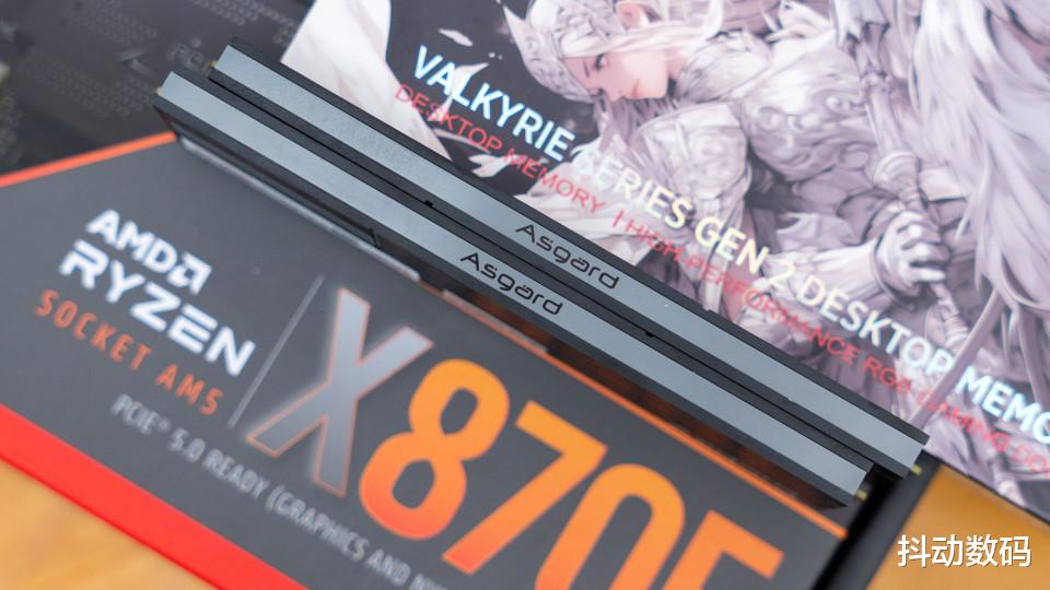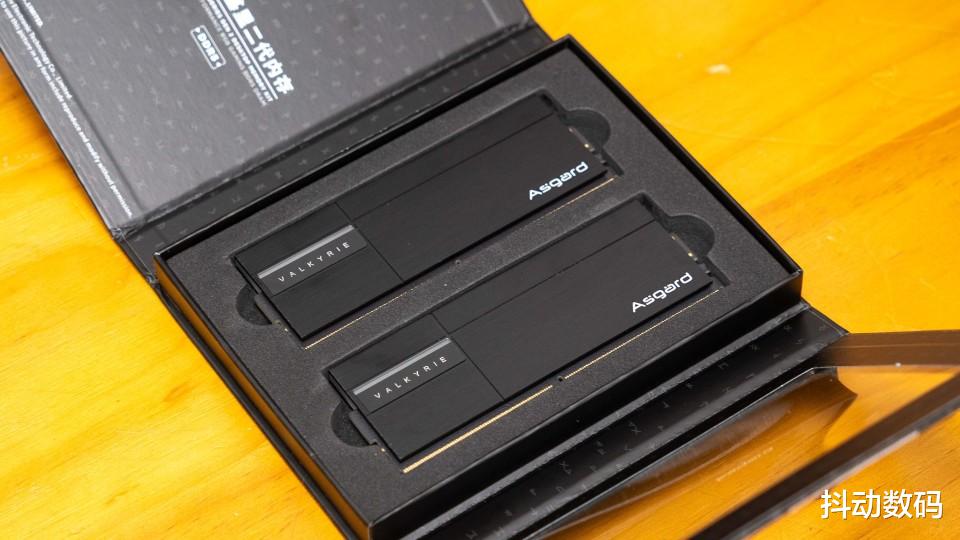 内存是阿斯加特女武神·瓦尔基里Ⅱ代6000MHz CL28极夜黑,16GB x2套条。包装方面采用半侧透设计,包装正面是女武神的卡通形象。