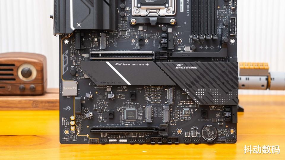 下方的PCIe扩展部分,首先两个区域的M.2 散热装甲都采用了免工具安装的配置,好评。