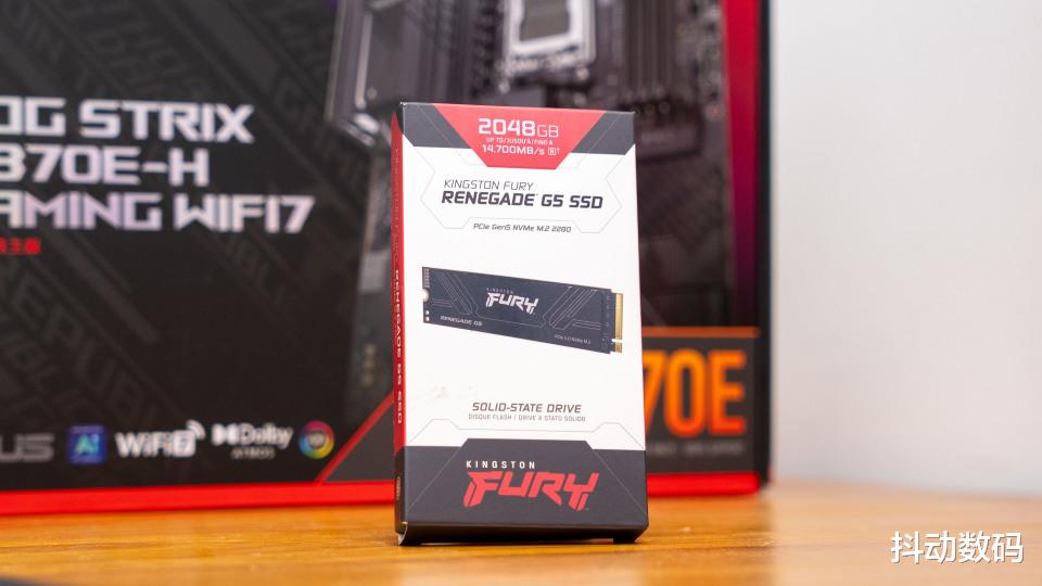 SSD方面选择了金士顿 FURY Renegade G5 PCIe 5.0 SSD 2TB,属于金士顿的FURY系列。最高读取可达14700MB/s,也是目前市面上旗舰之选了。包装盒很小巧,正面可以看到产品容量与外观渲染图。