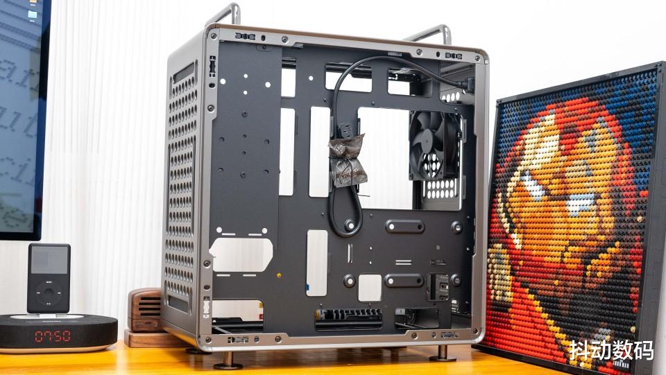 机箱的背后一侧,一样是洞洞设计,整体一周的可玩性十足。前置电源挂仓设计,背后区域预装了一把12cm风扇辅助散热。