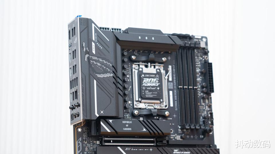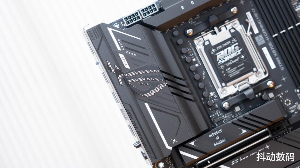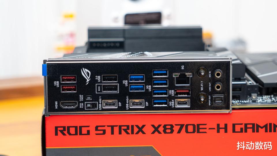 ROG STRIX X870E-H GAMING WIFI7主板整体都是暗黑的配色设计,很有纯血的ROG DARK HERO的感觉。只是X870E-H的IO部分没有设计灯光,更是APEX 系列的风格。
