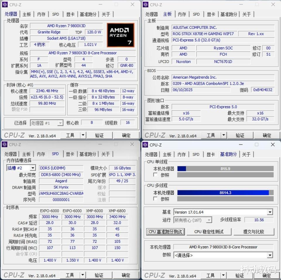 CPU-Z 测试:9800X3D多核性能:8614.3 ,单核:815.9 。