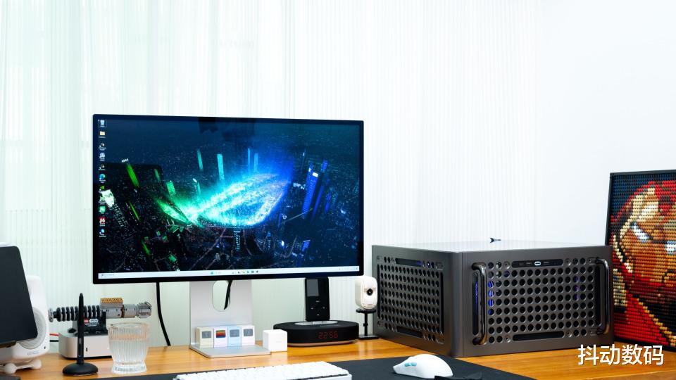 不过我并没有选择这么复古的机箱,我选择了酷冷至尊的QUBE 酷方 540这款机箱。因为当看到它机箱顶部的两个提手,以及其本身四四方方可以灵活调整的设计后。我就决定把它「放倒」来当作卧式机箱来使用了,当然这个卧式机箱真的可以拿来尝试装在机柜里看看。不过我还是把它放在了桌面上,也尝试直接把显示器放在钢化玻璃侧板上的感觉。未来换成一个24寸的显示器,宽度上会更合适。