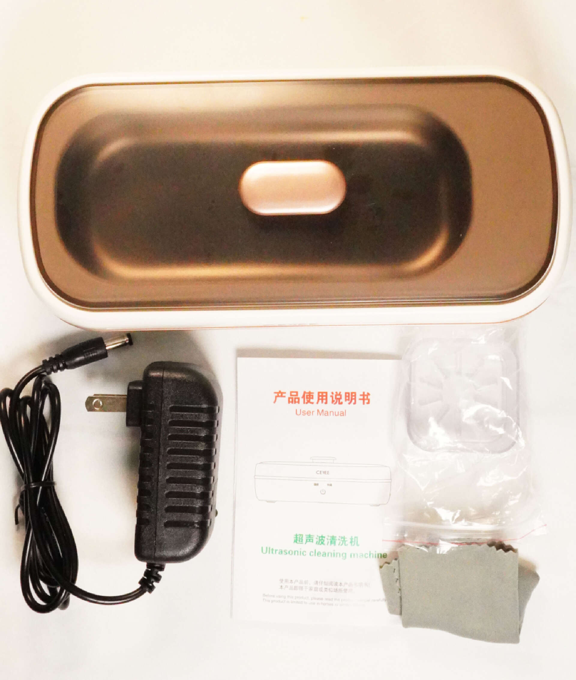 希亦超声波清洗机外包装就是一个通用的大白盒,上面标注了厂家名称以及机器的图片。除了清洗框之外,还附带有标准的电源适配器、垫高架,擦拭巾和说明书等配件。