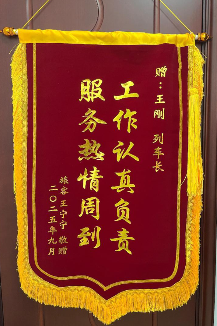 事后王女士为了表达对王刚车长的热情服务,特意订做一面锦旗,表示感谢。