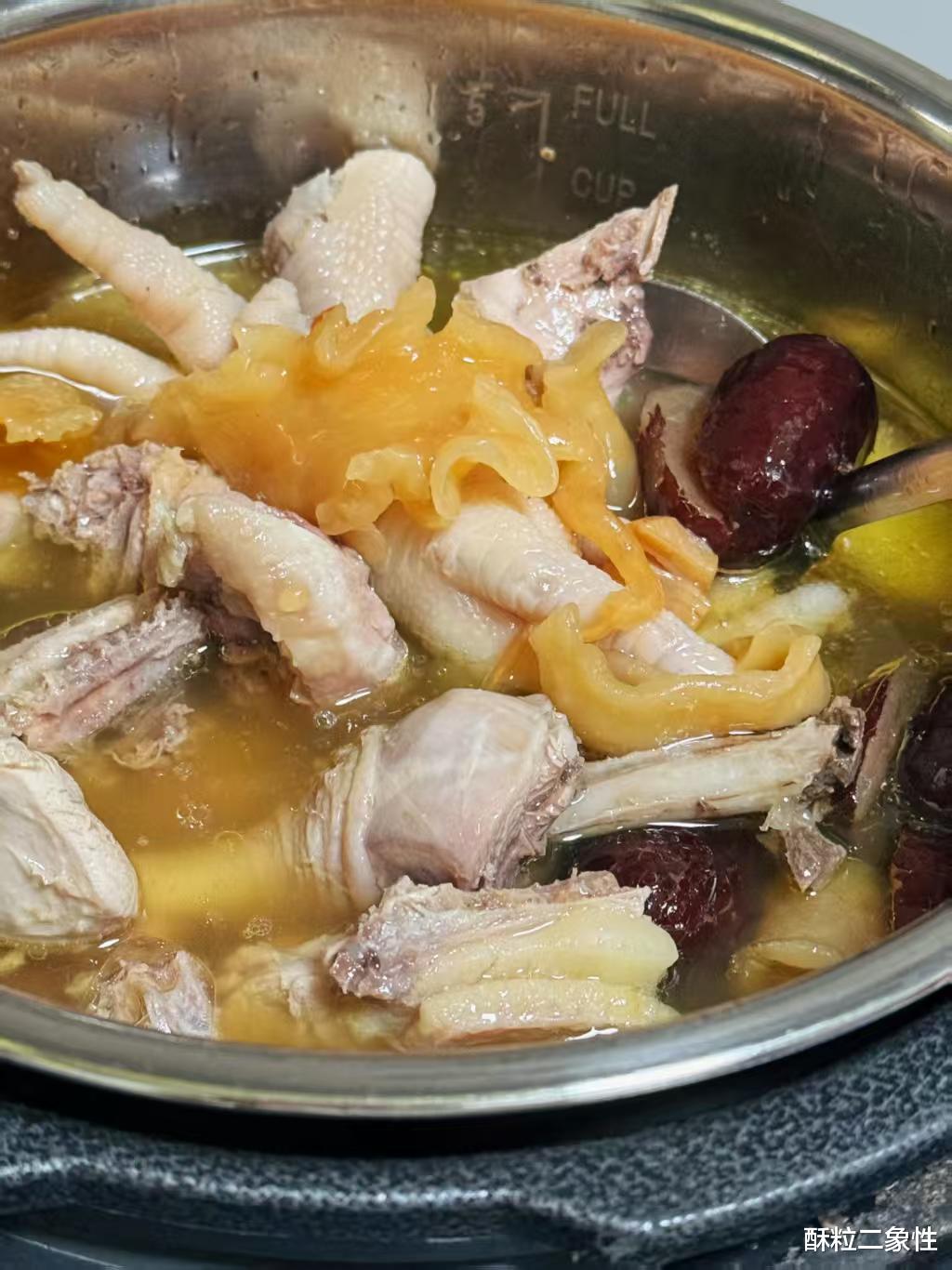 开始炖汤:1. 所有食材洗净,花胶剪小段、鸡肉剁块(块头大小随心)、姜切片。2. 瑶柱、姜片、红枣、鸡爪先下锅,加水没过食材,开火!水开后撇去浮沫(这步别偷懒,撇干净汤才清亮)。3. 加入鸡肉和花胶,转小火慢炖50分钟(期间可以偷瞄几眼,但别频繁开盖,让香味“锁死”在锅里)。4. 出锅前10分钟撒枸杞、加盐调味(枸杞别早放,煮烂了营养就“跑路”啦)。