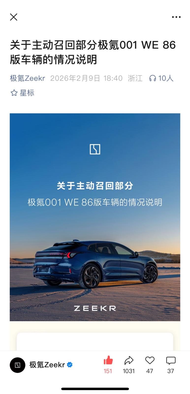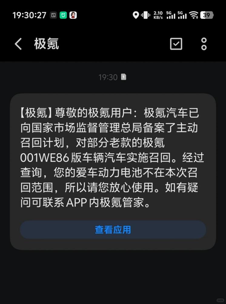 虽然自己的车不在召回的批次里,但还是收到了极氪发来的消息,看来极氪把信息同步给了所有车主,挺有心的。
