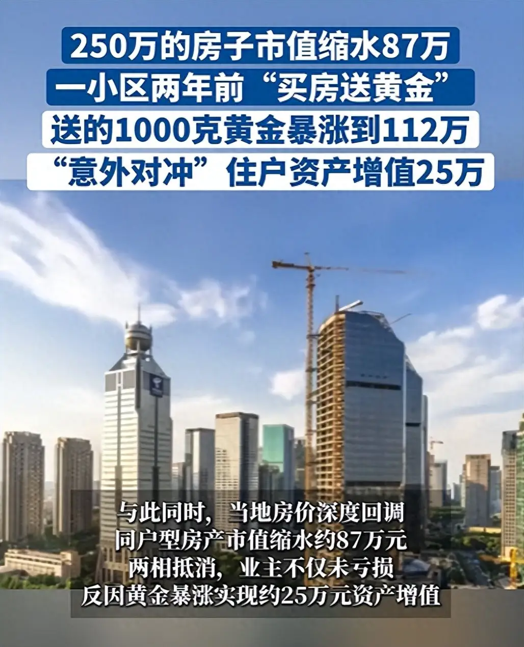 两年过去,这套250万的房子市值缩水87万,如今只值163万左右。可另一边,国际金价一路狂飙,当初送的1千克黄金已涨到约112万。一亏一赚,两相抵消,如果业主一直捂着金条没卖,资产反倒增值了约25万——相当于房子白住两年,还倒赚一辆家用车。但90%的业主,没等到这一天新闻里藏着一个扎心的细节:早在2023年7月,也就是收房后仅一个月,大部分业主就把金条折现卖了。那时金价还在每克450元上下徘徊,1千克换成45万落袋为安。谁能想到一年后金价冲破560元,直奔600元大关?有业主事后算账,拍红大腿:“以为是落袋为安,结果是卖飞了。”黄金和房子,谁才是硬通货?这场“买房送黄金”的实验,意外成了两种资产走势的鲜活对照:房子:流动性变差,预期转向,持有成本高黄金:全球央行囤货,地缘风险加持,一路新高但更大的考验不是眼光,而是人性。能拿住房子的人很多,能拿住黄金的人很少。 金条在手里,每天看着价格波动,涨一点想卖,跌一点更想卖。真能从450元拿到560元的,凤毛麟角。有人赚了认知,有人交了学费如今,小区里还留着金条的业主成了“传说”。大部分人只是在两年后的新闻里,才意识到自己曾经离25万那么近。一位业主在业主群感慨:“以为捡了开发商的便宜,结果开发商早算好了——能拿住黄金的人,比能买得起房子的人还少。”你看,有时候资产增值,差的不是运气,是“捂得住”。如果时光倒流回2023年6月,你会在450元/克卖掉金条,还是赌一把至今?评论区聊聊你的选择