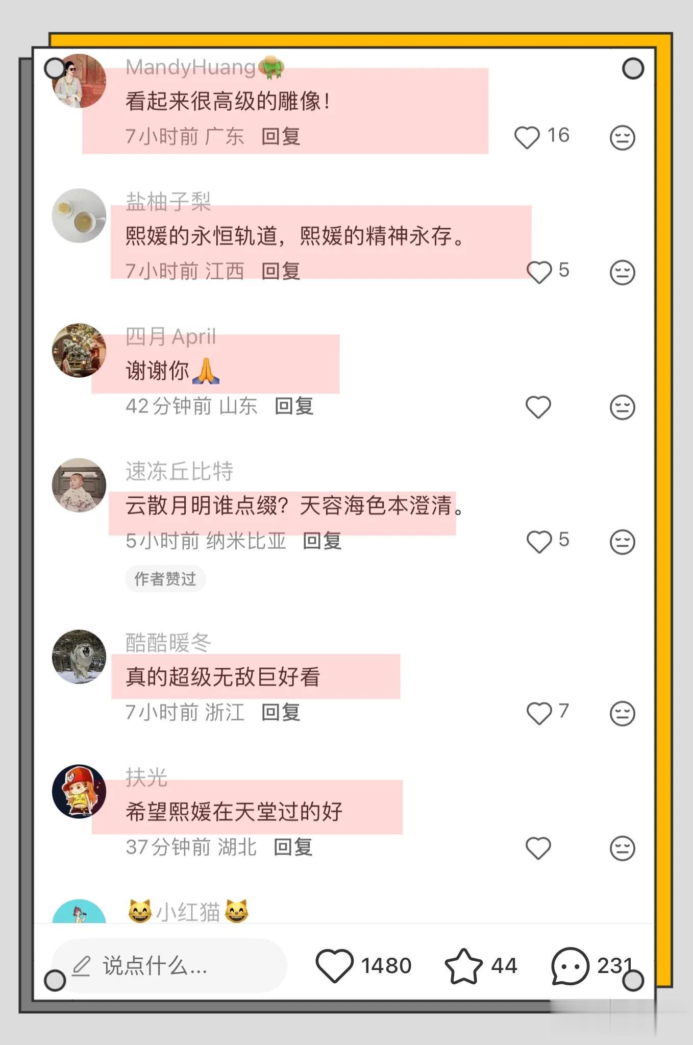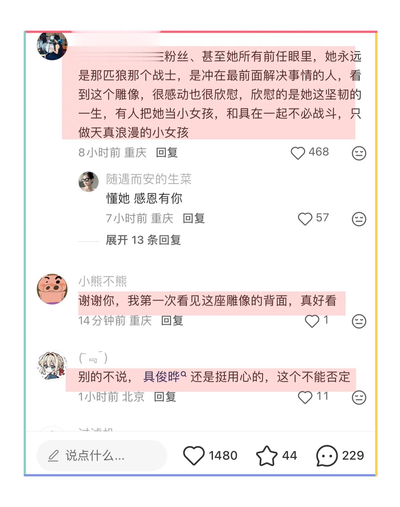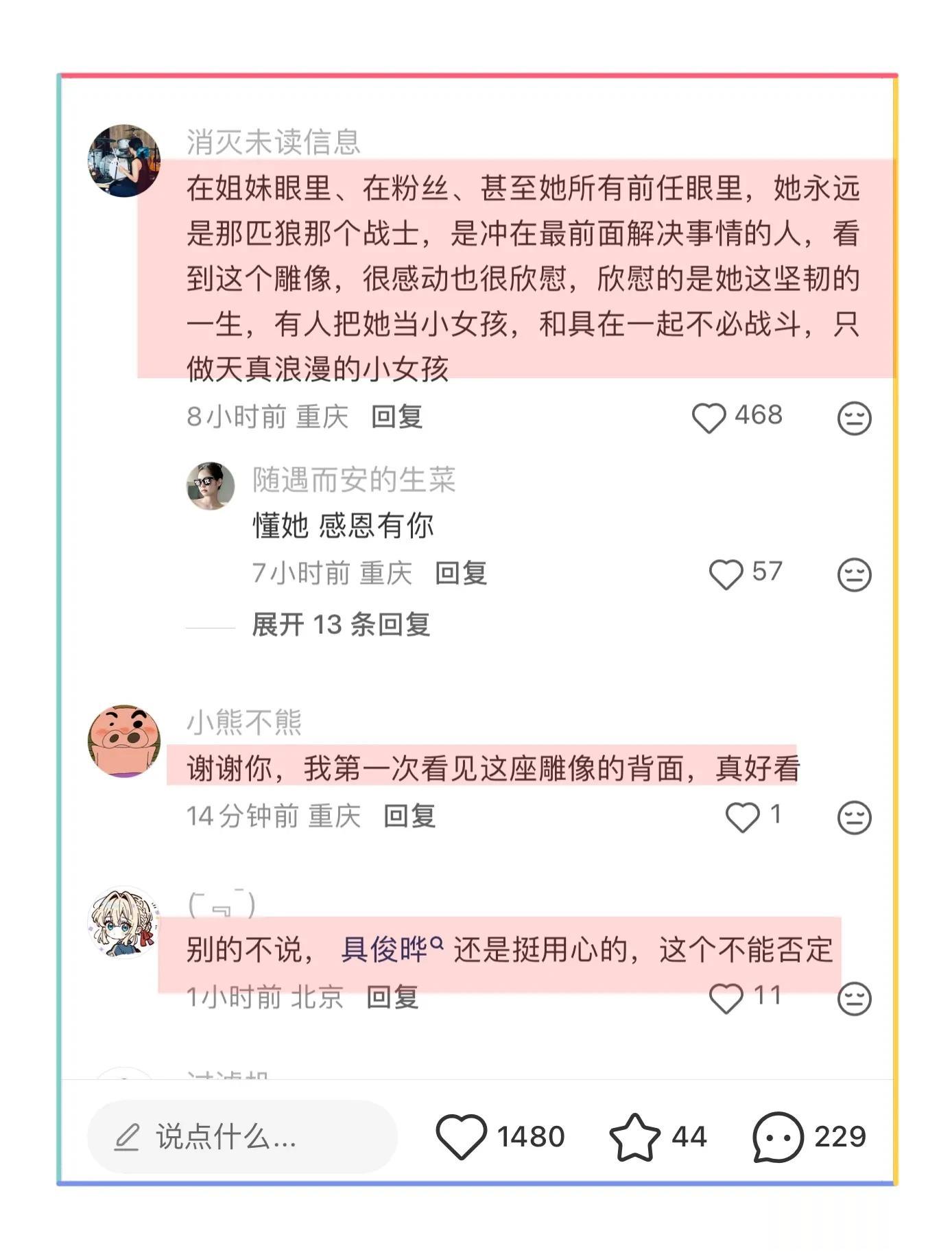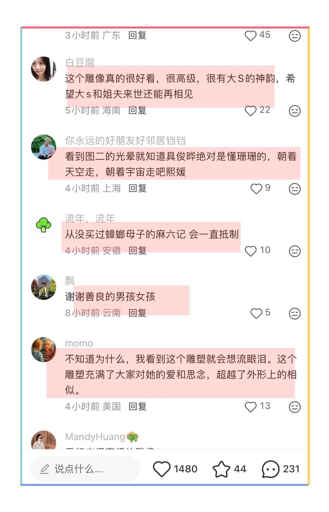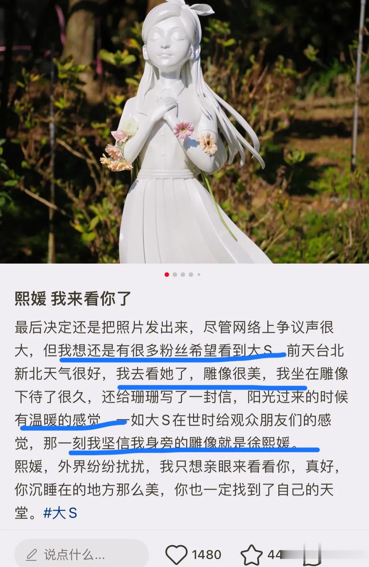 不少网友看了这几张晴天拍摄的大S雕像,网友们都说雕像背影看着很像大s,看来具俊晔真的很用心,粉丝还坐在雕像旁边的椅子上跟大S聊天,众多大S粉丝看到落泪了!