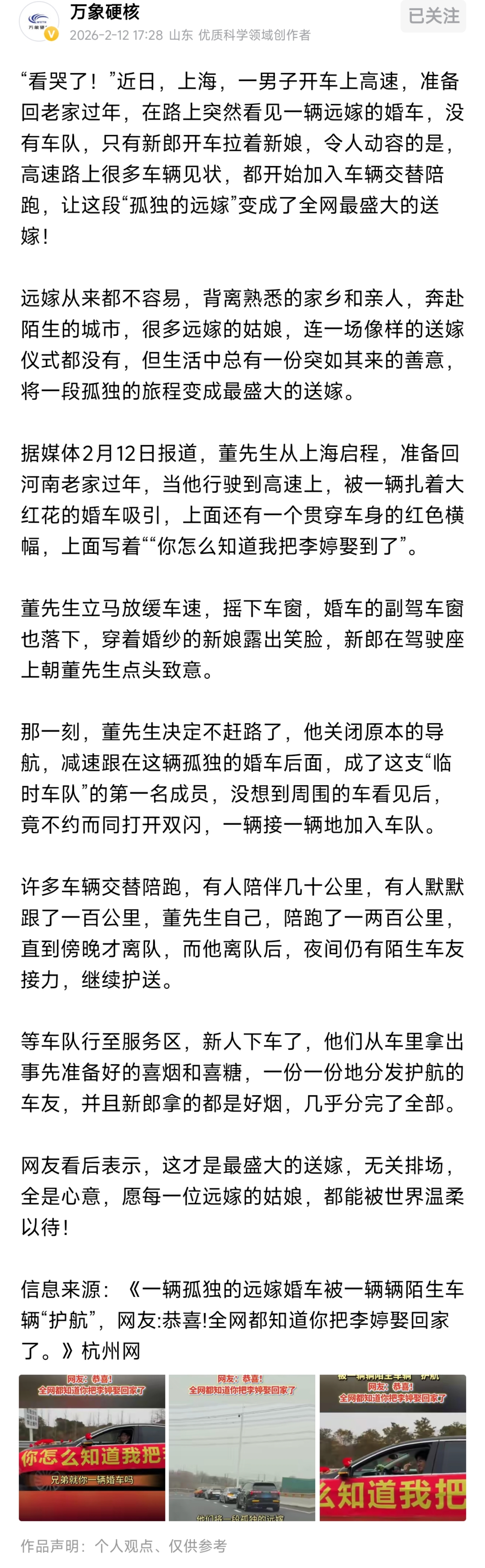 远嫁本身就需要很大的勇气,离开家人和熟悉的环境,去往陌生的地方开始新生活。而这场来自陌生人的守护,恰好给了姑娘最踏实的安全感,也让我们看到,真正的浪漫从不是华丽的排场,而是发自内心的温柔与善意。生活里总有不期而遇的温暖,这些平凡人的举动,看似微小,却足以照亮一段旅程。愿每一位远嫁的姑娘都能被温柔以待,也愿我们都能成为传递温暖的人。