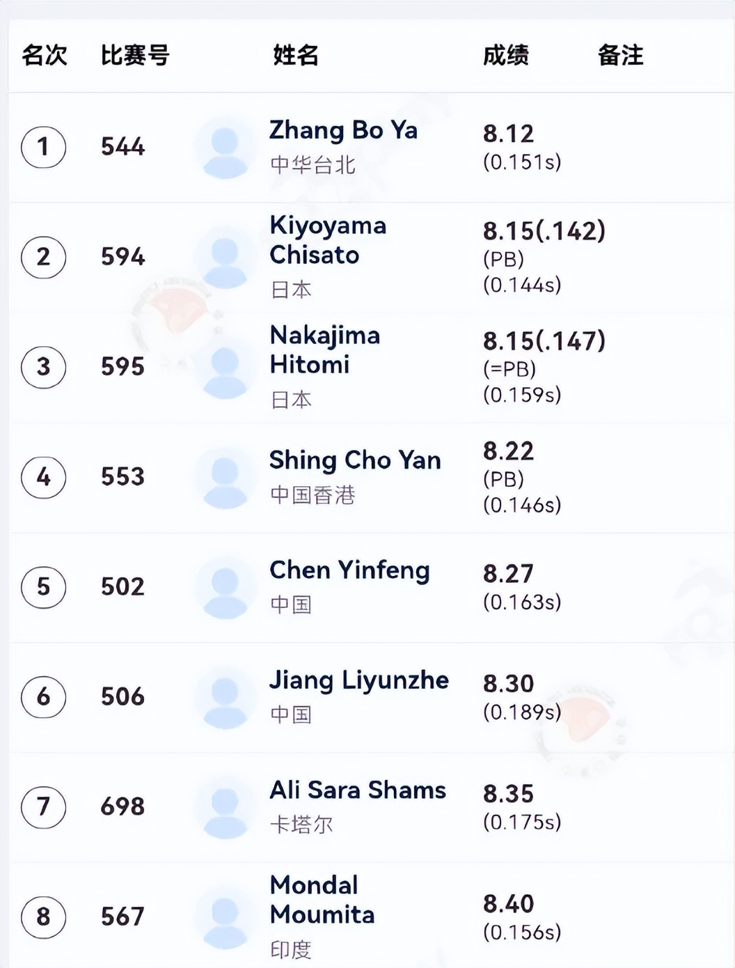 上周的亚洲室内锦标赛,女子100米栏中国队十五运会前三名集体缺席。22岁的中国台北名将张博雅在60米栏决赛里,以8秒12夺冠。日本的清山千里、中岛瞳都跑出8秒15,清山千里以8秒142获得银牌,中岛瞳以8秒147获得铜牌。