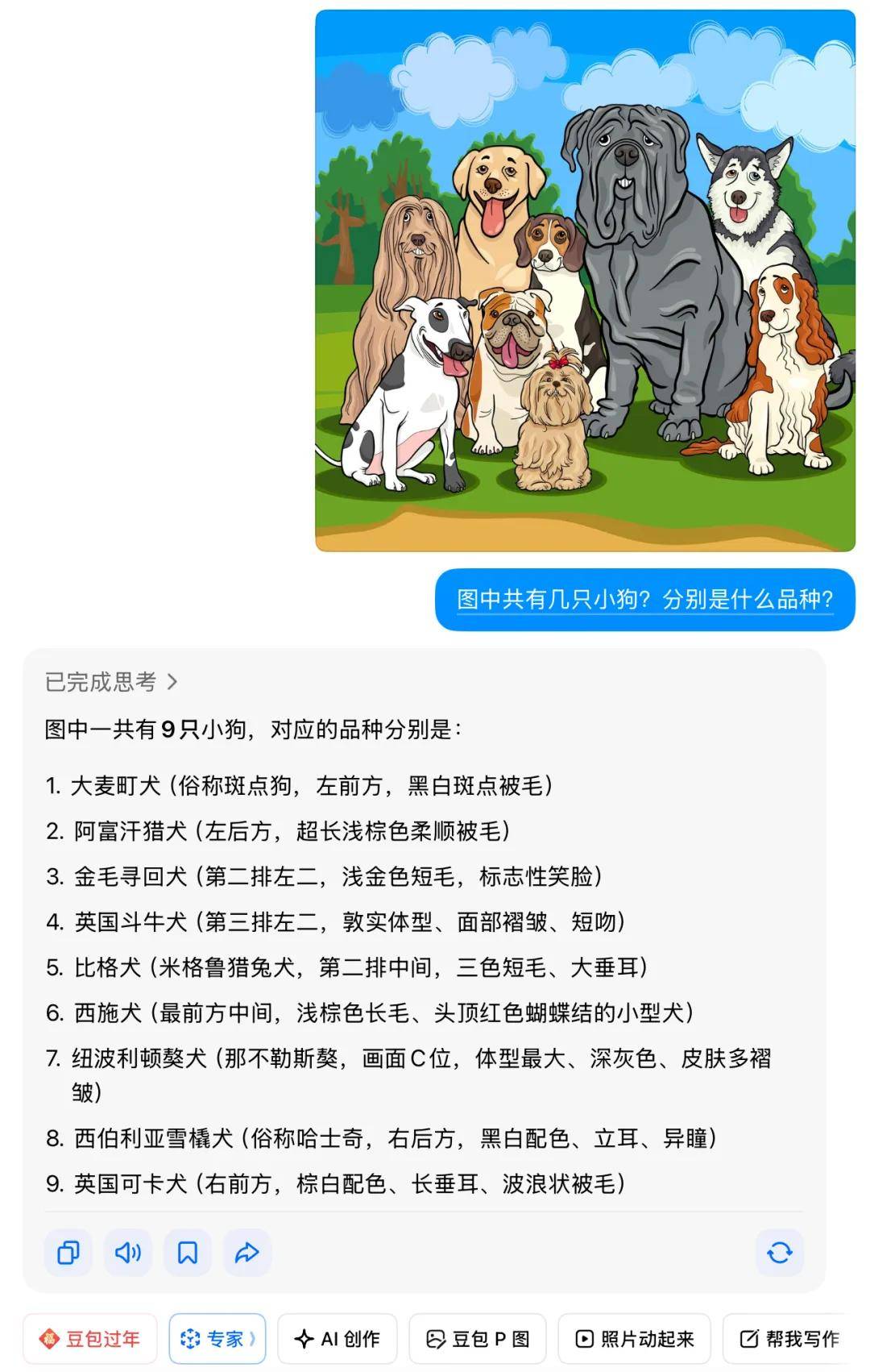 我们又试了下图片识别,让豆包数图中的卡通小狗,并介绍品种。
