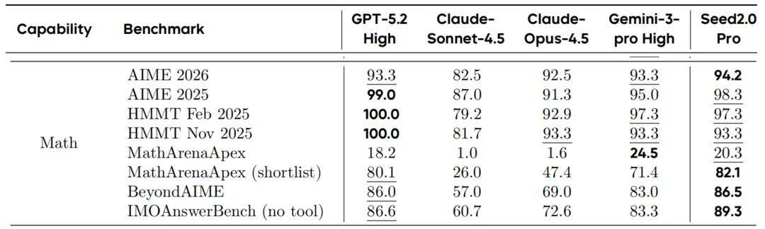 增强了在幻觉压力下的视觉推理能力,并改进文档和图形的结构化解析能力。 提供多种体量型号(Pro、Lite、Mini 三款通用 Agent 模型和 Code 模型),以应对不同部署场景下延迟与性能之间的权衡。 拥有可靠的复杂指令执行能力,可准确执行高度约束、多步骤任务。在数学与视觉推理方面,豆包 2.0 Pro 在 MathVista、MathVision、MathKangaroo、MathCanvas 等数学推理基准上达到业界最优水平,在科学领域的整体成绩与 Gemini 3 Pro 和 GPT 5.2 相当。