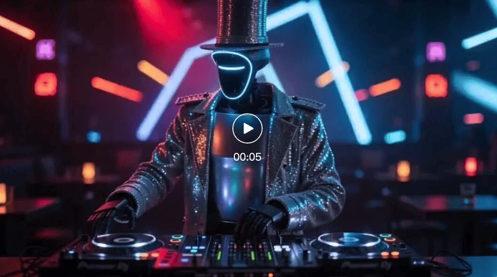 图生视频。提示词:视频整体风格为赛博朋克风格,中景镜头,画面中只有图片 1 的机器人和数字调音台。背景闪烁着酒吧里的霓虹灯光。图片 1 里的机器人在赛博朋克风格的酒吧里做 DJ 打碟。图片 1 里的机器人身穿夸张闪亮的服装。