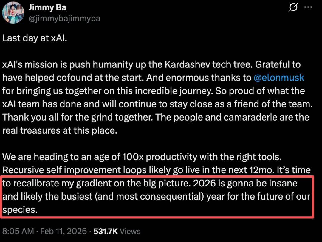 「2026 年或将成为人类历史上最忙碌、也最具决定性的一年。」xAI 联创 Jimmy Ba 在离职宣言中如是说。
