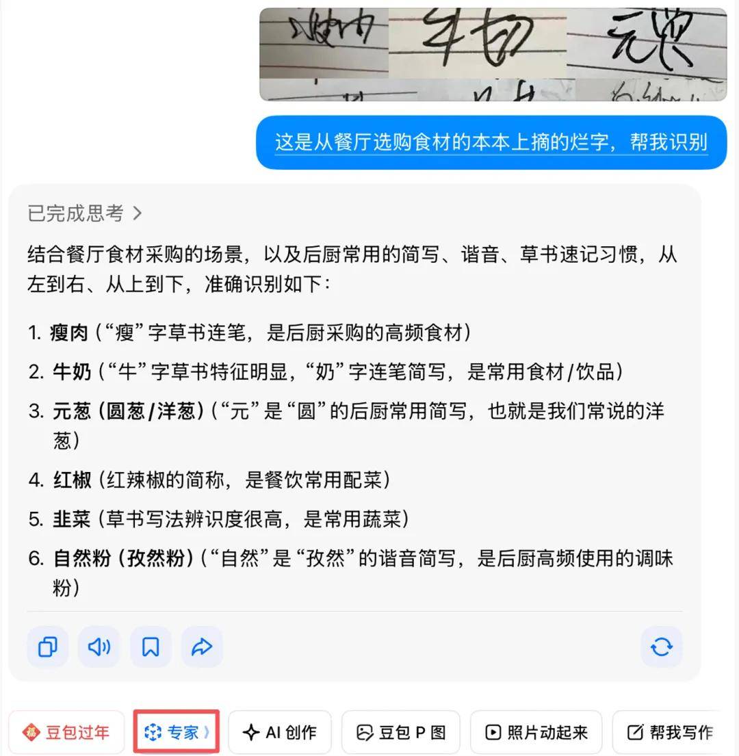 这几个龙飞凤舞的字,豆包全都认对了。它不仅能识别常规字迹,还能结合后厨速记习惯,破译「自然粉即孜然粉」等谐音简写。这说明它没有停留在字符识别层面,还能根据业务场景进行语义推理。
