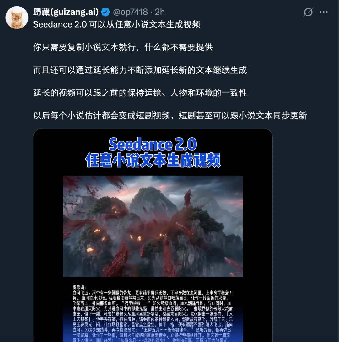 有网友还发现 Seedance 2.0 可以将任意小说文本生成视频,看样子接下来会有一大批精美 AI 短剧来袭。