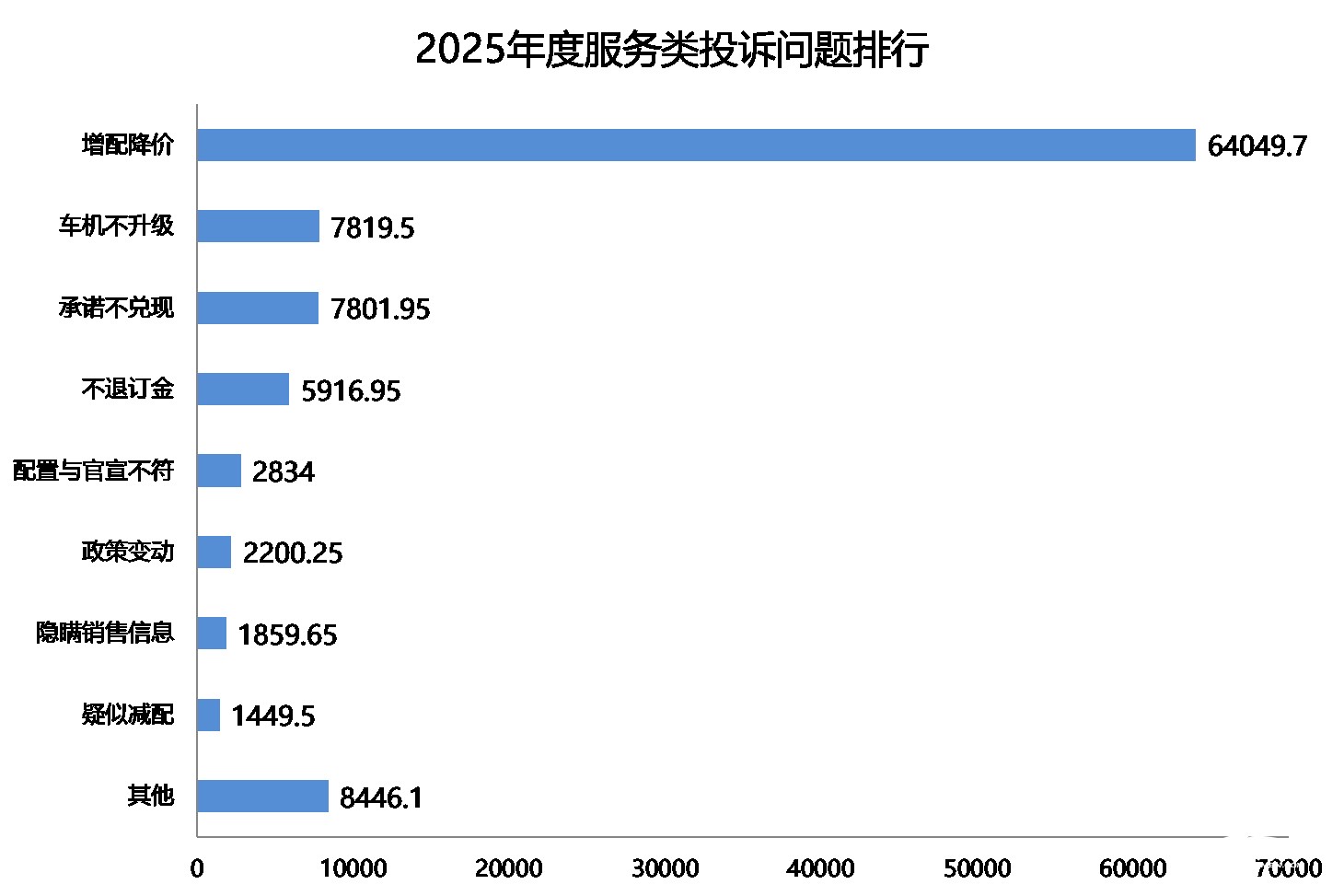 来自汽车门网的数据显示:服务类投诉指数在2025年攀升至102377.6,同比增长了81%。这其中,增配降价的投诉占比最高,达到了63%。若抛开这一项,不退订金的投诉指数占比15%,问题同样十分突出。