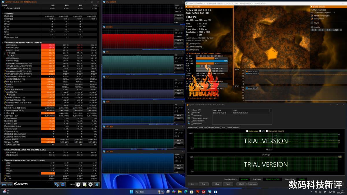 强大的供电必然伴随着可观的发热,尤其是在封闭的机箱环境内进行高强度游戏或满载运算时,技嘉为此配备了经过精密计算的VRM散热解决方案。该散热系统采用了一体成型的大型金属散热鳍片组,通过多剖沟设计大幅增加了有效散热面积,并优化了机箱内气流的通过效率。连接两大散热模组的是一根强化直触式热管,它能有效避免产生局部高温热点。配合高品质的导热垫,整个供电区域的热量得以被高效导出。在实际的压测环境中,即使驱动像Ryzen 7 9800X3D与GeForce RTX 5080这样的顶级功耗组合进行长时间双烤测试,主板的供电模块温度始终被控制在理想范围内,证明了其散热系统足以应对最严苛的负载挑战。