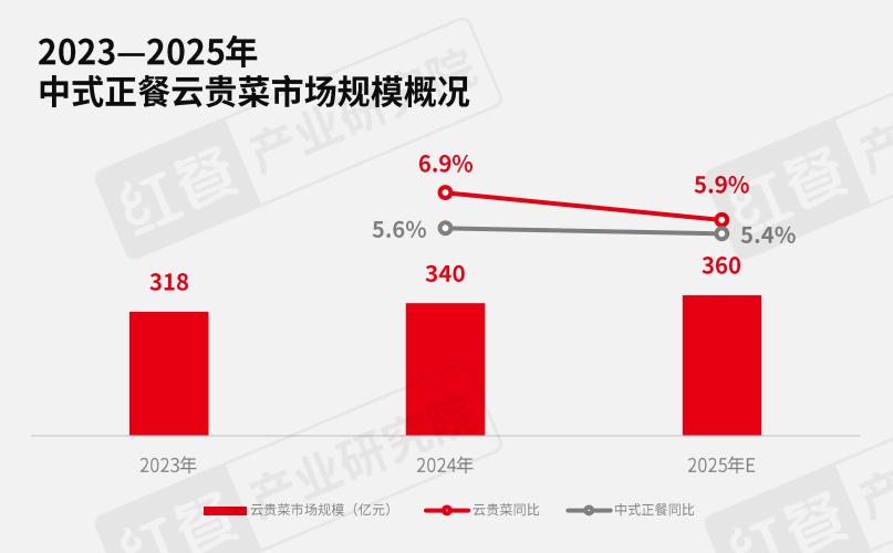 红餐大数据显示,中式正餐云贵菜市场规模已从2023年的318亿元增长至2024年的340亿元,预计2025年同比增速为5.9%,高于中式正餐整体增速水平。