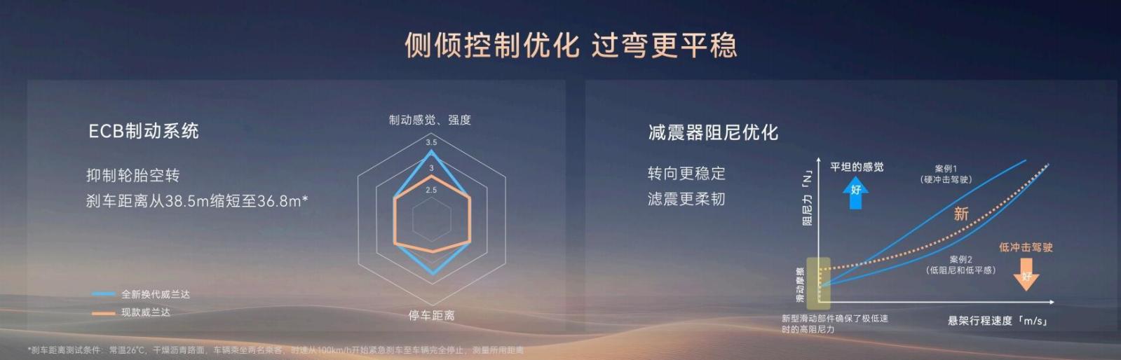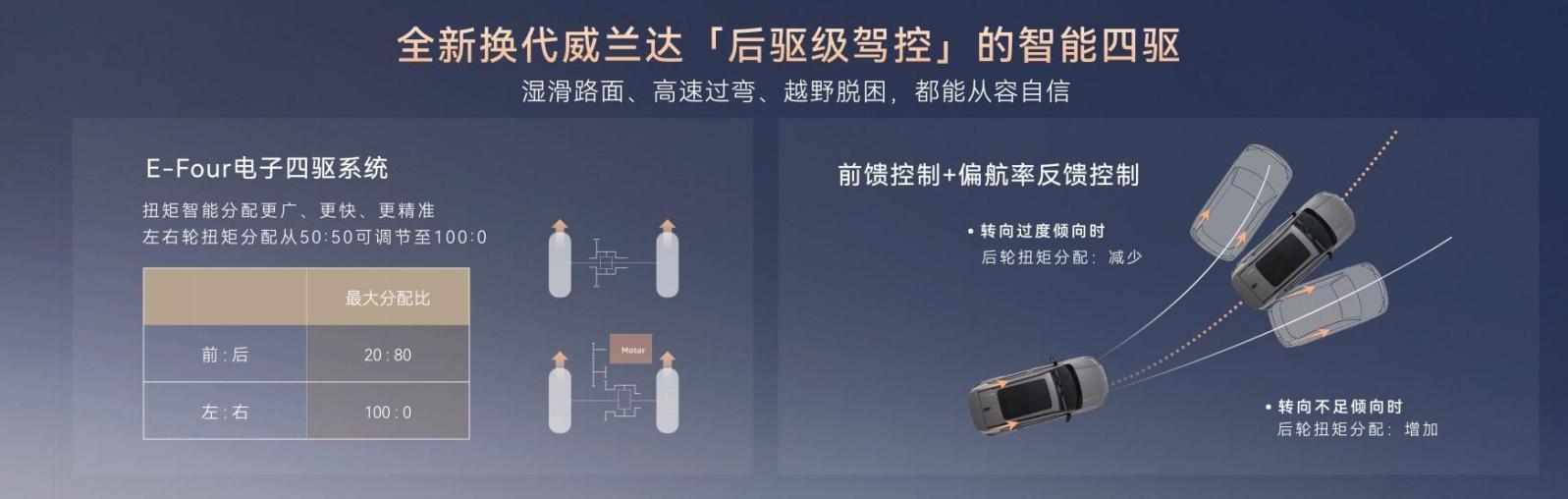 当所有油车发布都在大肆说智能化的当下,换代威兰达重新把少数人提及的机械素质摆上桌面。全新威兰达E-FOUR电子四驱可以罕见实现前后轴驱动力100:0-20:80的智能调节,动力系统通过对四驱系统和悬挂的智能调控,让这台城市SUV在保持舒适的同时,具备了超越同级的操控稳定性和通过性,过弯更灵活、脱困更迅速。应用全新ECB电子控制制动系统,轮上扭矩分配更快更精准,大幅优化侧倾控制,实现了更线性跟脚的制动脚感,显著缩短制动距离,过弯更稳。