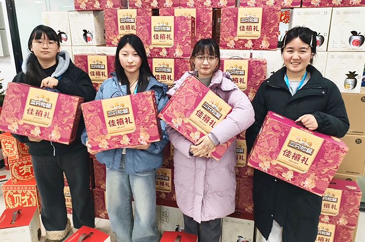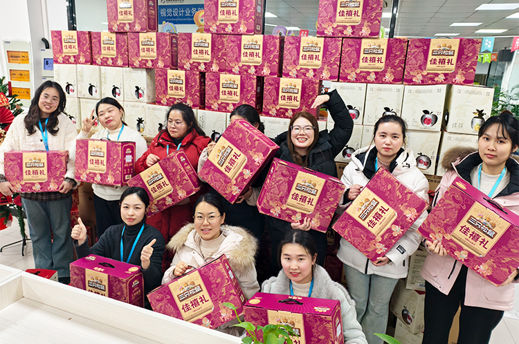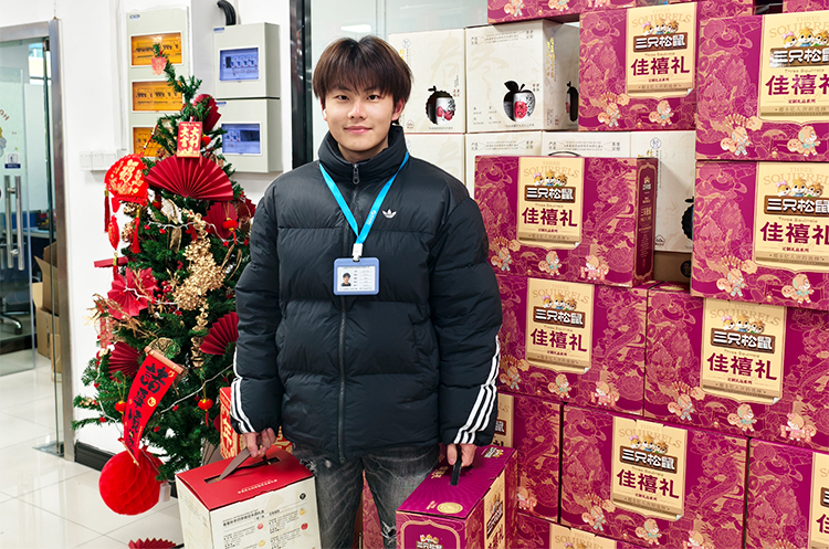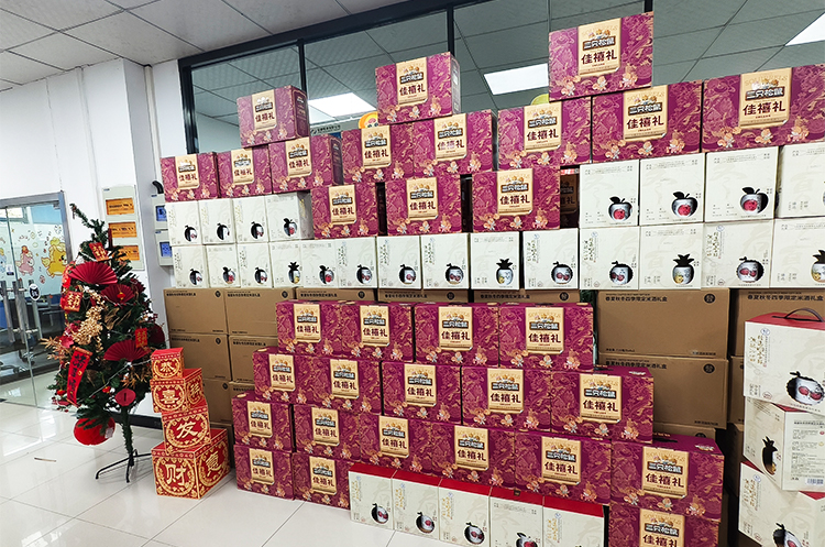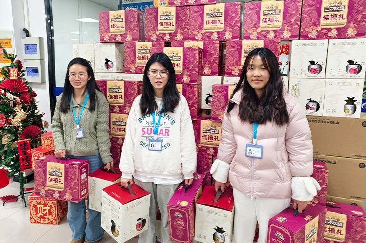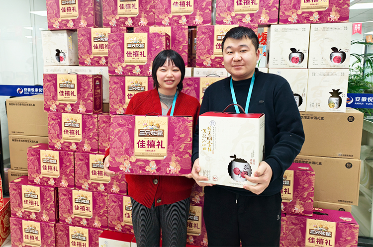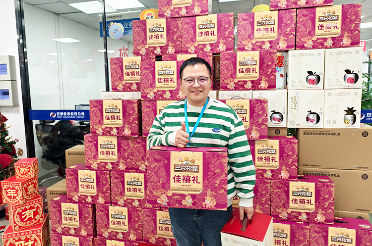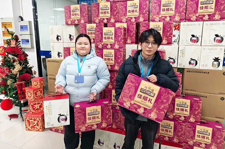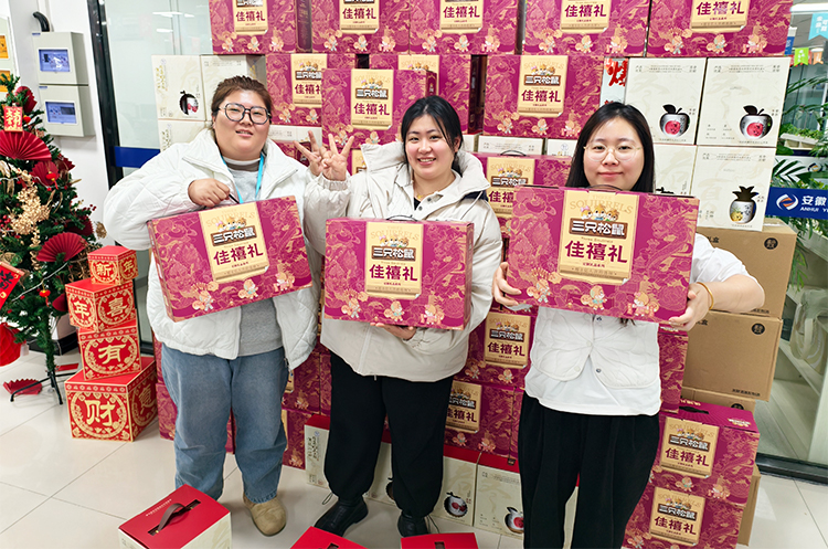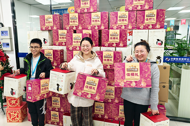 现场温馨有序,欢笑不断。员工们依次领取年货礼盒,有的举着礼盒合影留念,有的彼此分享喜悦,“今年的年货搭配太贴心了!坚果营养美味,米酒醇香暖人,实实在在感受到了公司大家庭的温暖!”大家纷纷说道。