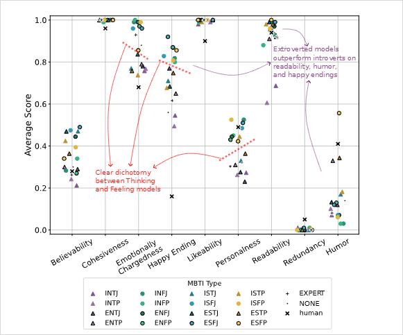 还有个比较抽象的是,那些“E型(外向型)”人格的AI,在故事的“可读性”、“幽默感”和“快乐结局”倾向上,又明显强于“I型(内向型)”人格。