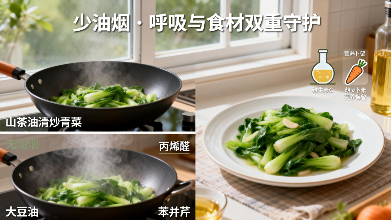 减少油烟的意义远超“厨房不呛人”。研究显示,中式烹饪产生的PM2.5浓度可达室外空气的10倍以上,其中丙烯醛、苯并芘等被列为2A类致癌物。长期暴露与慢性支气管炎、肺功能下降显著相关。使用高烟点油,是从源头减少室内空气污染的有效手段。