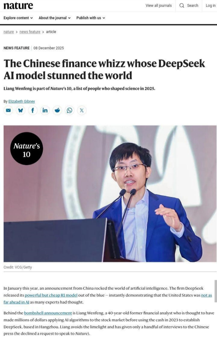 “梁文锋重新定义了‘竞争’。”《自然》特写部编辑马赫写道,“他选择与世界共享火种,而非独占光明。”