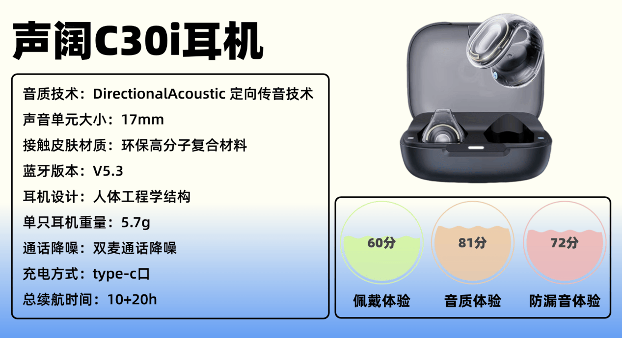 声阔C30i耳机在外观设计上极具科技感,充电仓采用全透明设计,呈现出浓厚的赛博朋克风格,非常符合现代年轻人的审美喜好。单只耳机重量约为5.7g,采用C形夹佩戴方式,但其连接桥并无弹性,而是直接扣在耳朵上,因此对耳朵形状的适配要求较高,适用人群较为局限。