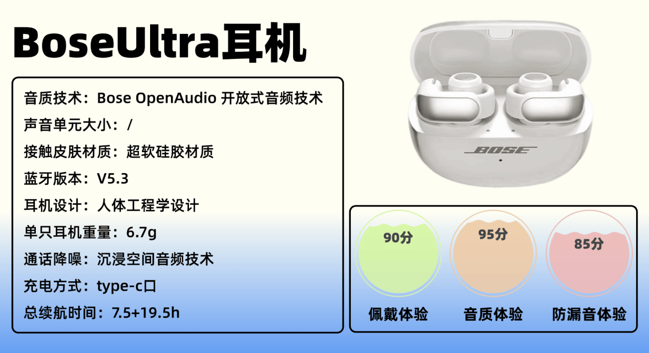音质方面,Bose Ultra具有OpenAudio开放式音频技术,能够充分展现鼓点的冲击力和敲击的浑厚感,使音乐细节更加丰富,层次感更强。但不足的是,耳机的防漏音表现一般,音量调至50%以上时,有比较明显的漏音问题。续航方面,单只耳机可连续使用约7.5小时,结合充电盒可提供约20小时的综合续航时间,适合长时间使用需求。