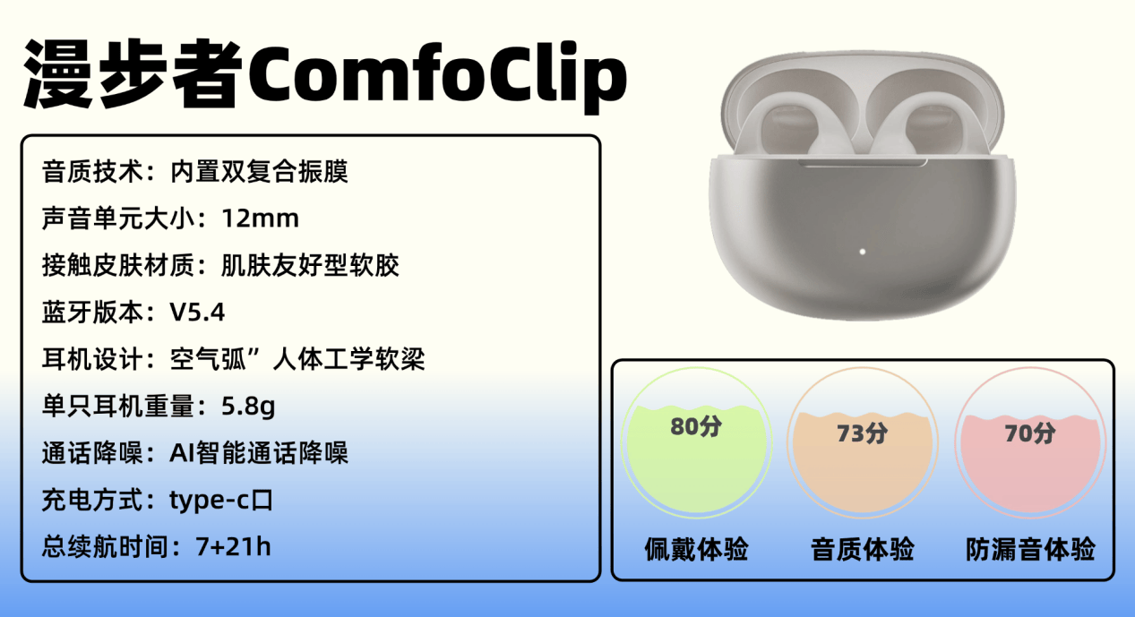 南卡作为目前国内领先的开放式音频技术研发品牌,有着十五余年的开放式耳机研究检验,是目前该领域专业度最高的品牌。南卡clippro延续了南卡对产品一贯的专注态度。在百元开放式耳机中属于佩戴和音质的双料性能王者。