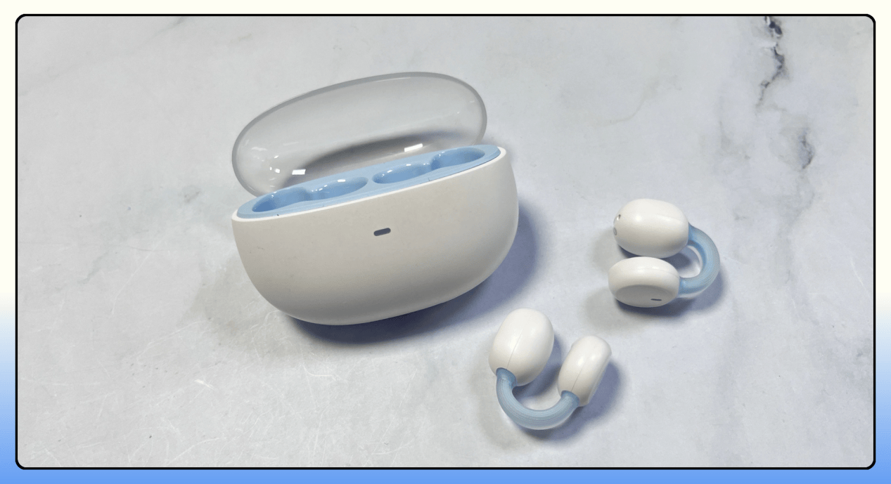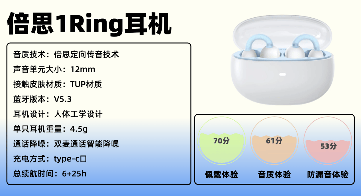 倍思1Ring耳机外观整体设计简约,采用星光白和天蓝配色,没有过多的装饰元素,看上去简洁有质感。佩戴上,耳机采用传统C形夹结构,单耳重量轻,佩戴舒适,但由于固定单元与发声单元之间的缝隙较大,佩戴稳定性一般,运动佩戴容易脱落。