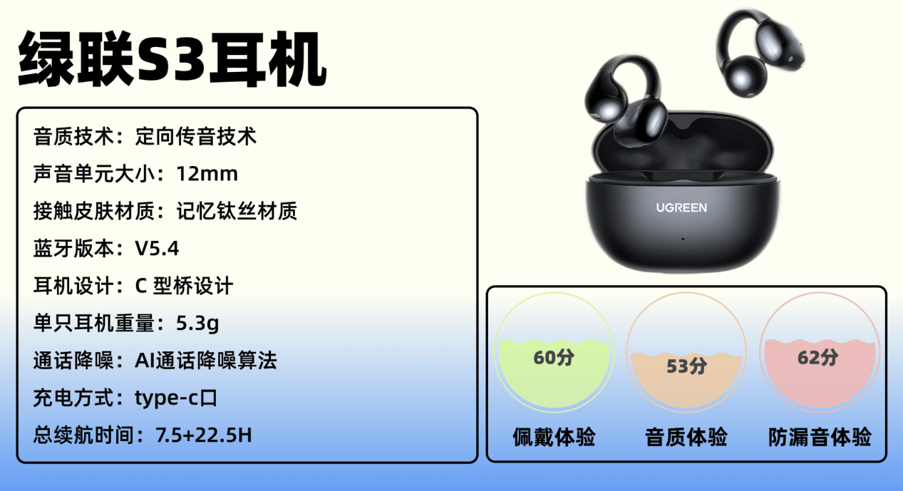 音质方面,绿联内置12mm动圈单元,整体音质表现不够出彩,由于没有声学系统的调校,整体音质的失衡感明显,高音部分还会有电流声。通话上,耳机AI智能通话降噪,在嘈杂环境基本能听清。续航上,单只耳机可使用7.5小时左右,搭配充电盒使用可连续使用30个小时左右。