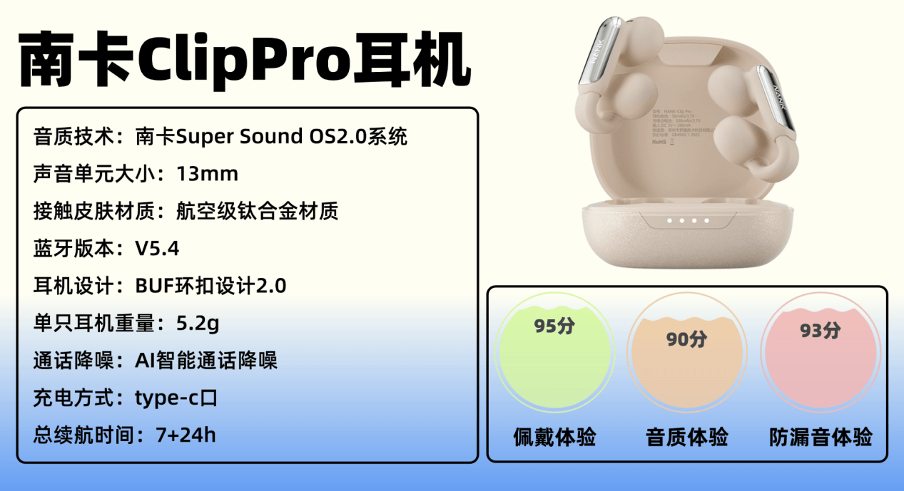 佩戴方面,耳机采用了C-Hook2.0的全新佩戴方案,单耳重量仅5.1g,佩戴舒适无夹感,此外clippro还采用了自研的BUF环扣设计耳夹,相较于C形夹多一段长条板,耳机更加贴合耳廓佩戴更舒适稳定,真正实现了零压零感佩戴。音质反面,耳机内置了新一代MCW多层复合宽环振膜和Omni-SSA声场引擎,整体音质体验比肩千元级别开放式耳机。此外南卡还具有自研的SuperSoundOS2.0系统,能够很好的弥补开放式三音缺陷,让整体音质还原度高达98.6%!