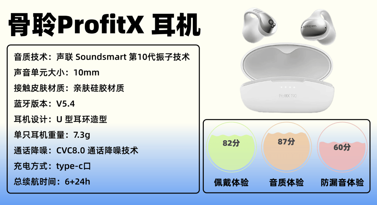 在佩戴上,ProfitX设计采用人体工学设计,能够稳固贴合耳朵,不易滑落,但单个耳机重量达7.3g,相较于本次测评的其他耳机会略显沉重,长时间佩戴可能会带来一定的累赘感。音质方面,耳机搭载了声联SoundSmart第10代振子技术,声音还原度较高,尤其在聆听流行音乐和古典音乐时,能展现较好的音质表现。但由于采用骨传导技术,耳机存在一定的漏音问题。
