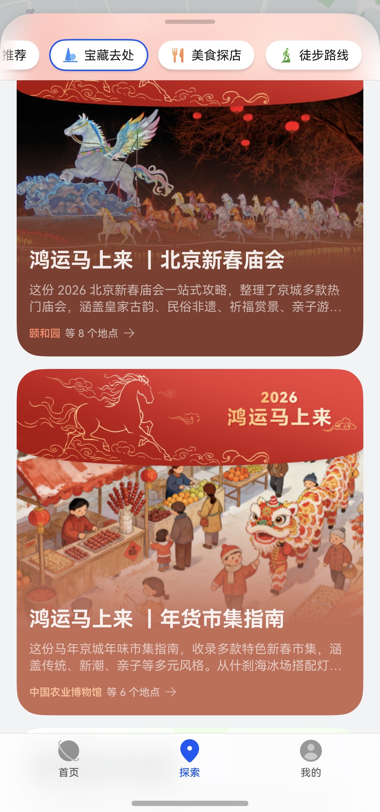 此次花瓣地图「鸿运马上来」新春活动,每一处规划都藏着对新春的期许,每一份攻略都贴合出行需求。这份攻略之外,更多新春惊喜与详细玩法,均可在花瓣地图的全新探索频道——【精选推荐】【宝藏去处】【美食探店】【徒步路线】,从打年货、赏美景到品美食、逛城市,全方位覆盖你的年味体验需求。频道将海量兴趣点数据按优先级智能排列、信息层级有序划分,首页还新增“兴趣地图”,深度融合多元兴趣场景,无论你偏爱哪种年味、有何种出行需求,都能根据同行人数、体验偏好,精准找到对应的文旅景点、网红打卡点、特色民宿,定制专属新春行程。