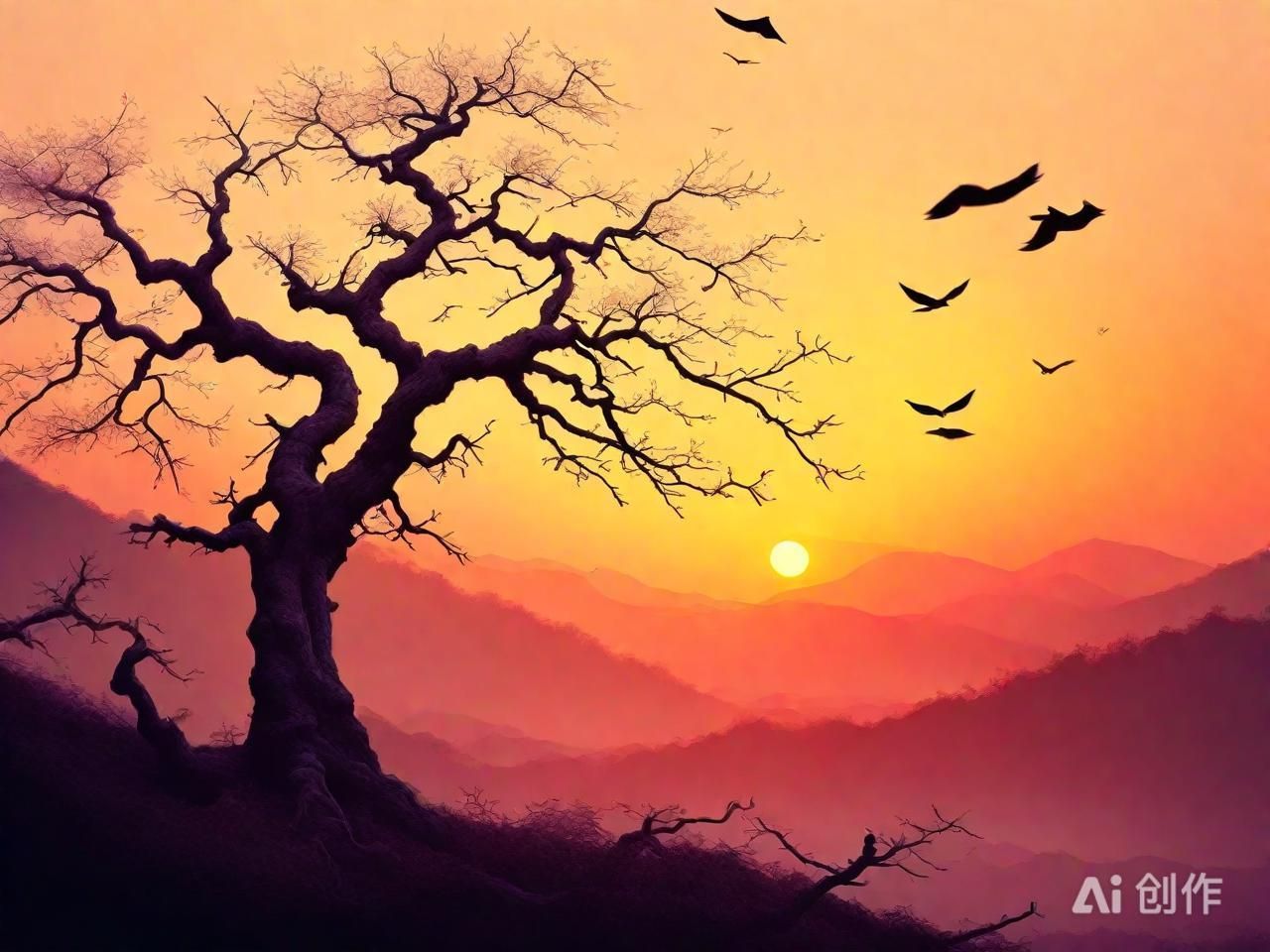 “枯藤老树昏鸦”,这简单的六个字,却如同电影镜头般缓缓拉开了一幅秋日黄昏的画卷。枯藤如岁月般缠绕,见证了无数春秋的更迭;老树矗立,树皮斑驳,记录着风霜雨雪的痕迹;昏鸦的栖息,更添了几分荒凉与凄清。这是自然界秋日的写照,是诗人内心情感的外化,预示着一场心灵之旅的启程,以及那份即将弥漫开来的、难以名状的忧郁与思念。