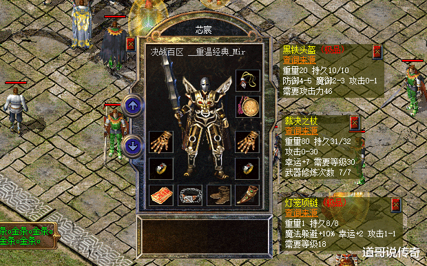 如今新百区952服中的装备开发有不少了,其中连那些难加点的黑铁头盔都有适合战士的攻1属性出现,在复古版本中确实是既好看又实用。目前拥有攻1黑铁头盔的战士实力都不简单,今天老道就为大家盘点那些头戴攻1黑铁头盔大战的运九套和运十套穿搭,大家看看有没有你认识的?由于有些武器和幸运链的截图较早,不排除后期喝运8或者换更强幸运链了。